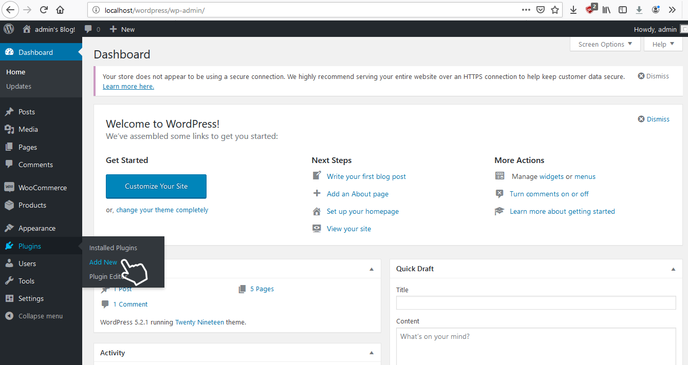Wordpress account, hover over Plugins on the left hand panel and click on Add New.